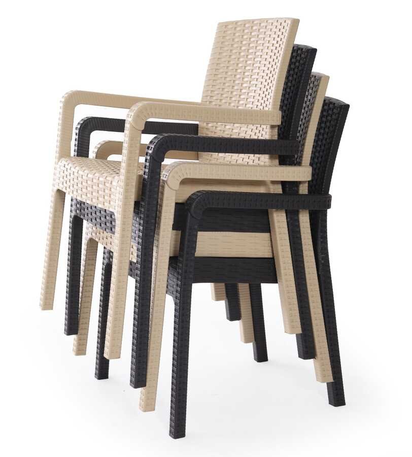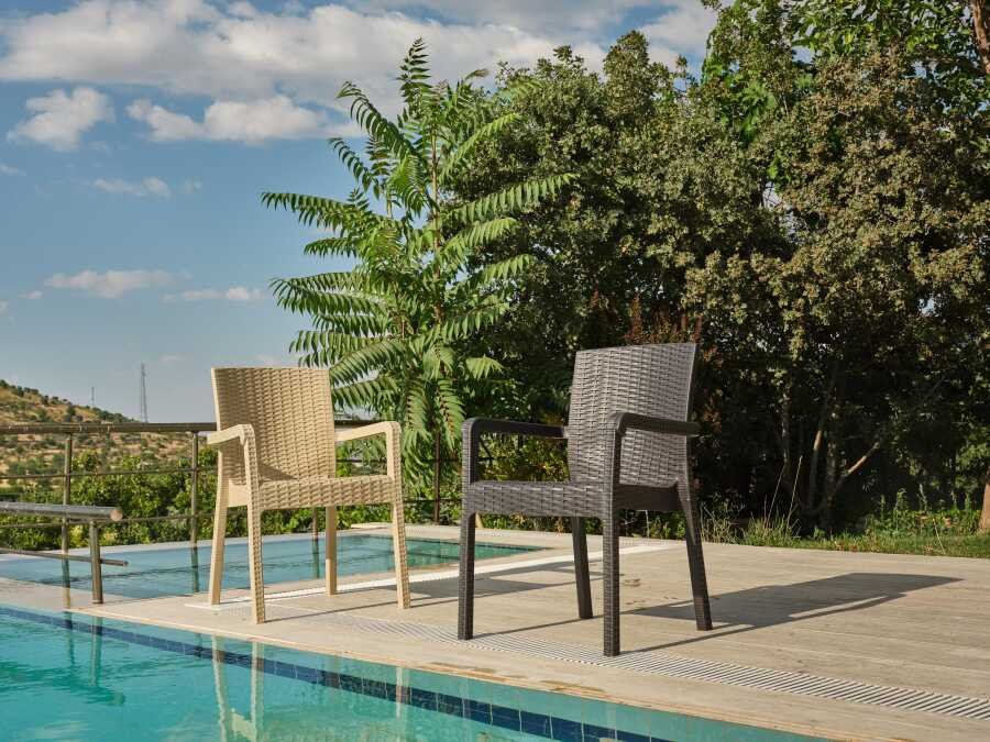 ✅ Malzeme: Sentetik rattan örgü — UV ışınlarına, neme ve paslanmaya karşı dayanıklı; dış mekan kullanımına uygun