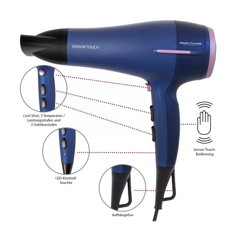 > Sensörle dokunma işlemi – dokunmatik sensörle akıllı saç kurutma. Saç kurutma makinesi elden çıkarıldığında otomatik olarak kapanır.